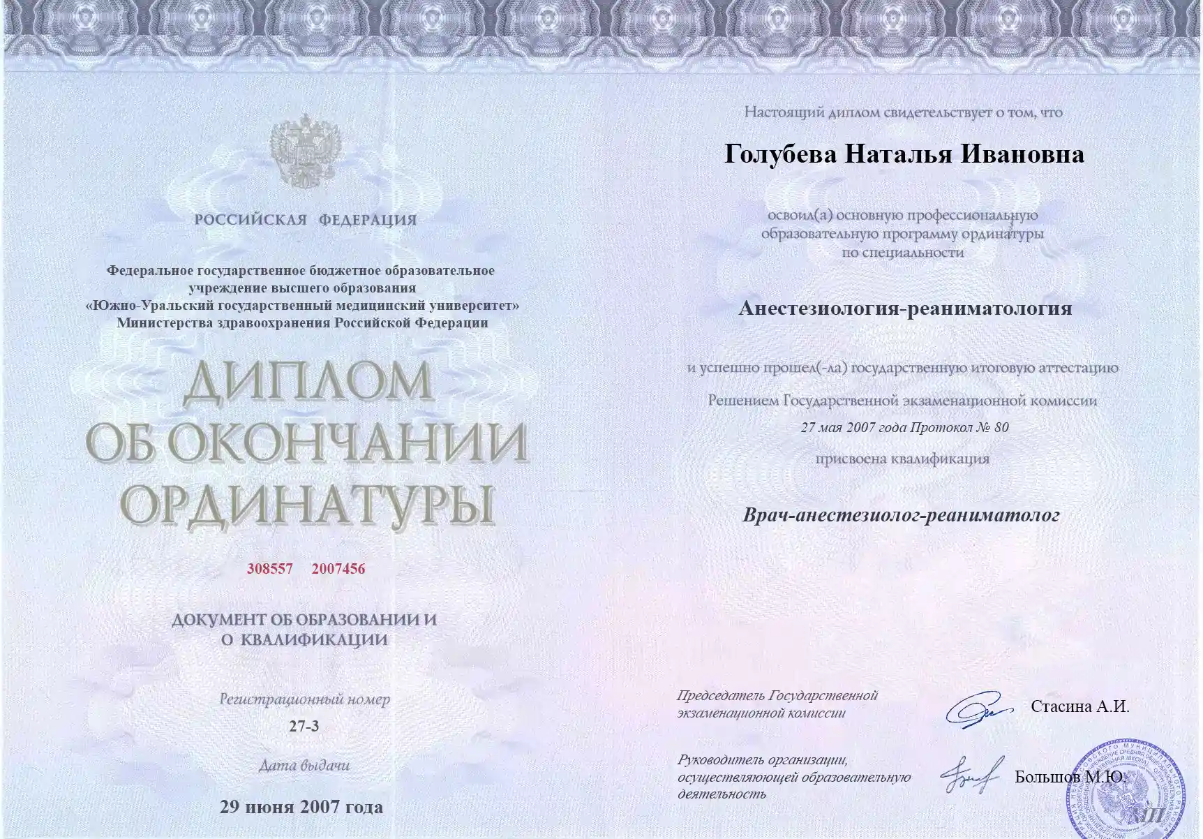 В 2005 году получила диплом по специальности «Лечебное дело» в Южно-Уральском государственном медицинском университете. В 2007 и 2011 году закончила ординатуру и курсы повышения квалификации по анестезиологии и реаниматологии.